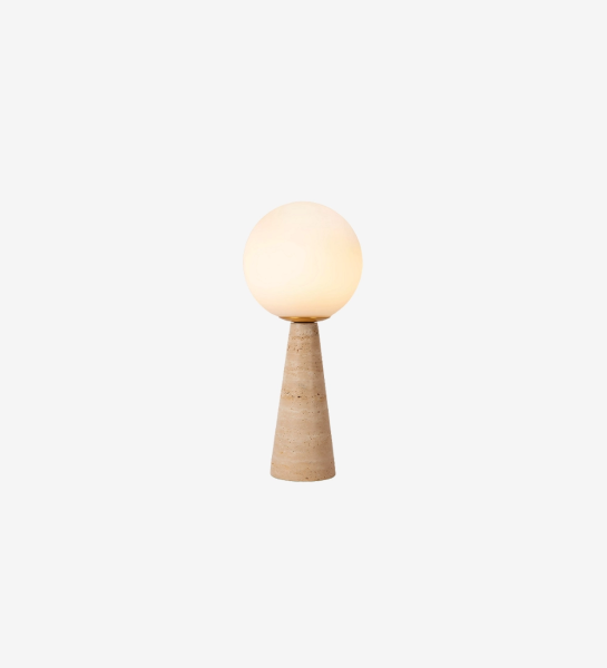 Lámpara de sobremesa con base de piedra beige y tulipa de cristal opal.
